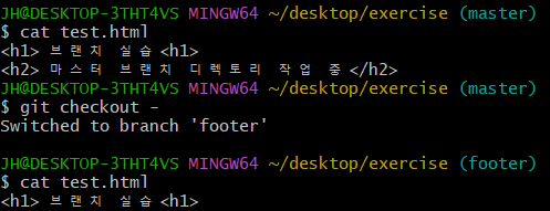master 브랜치와 footer 브랜치의 test.html 코드가 다른 것을 확인할 수 있다.