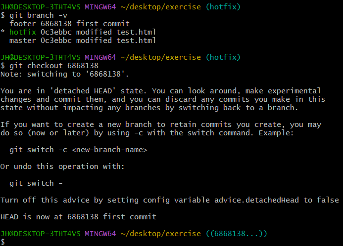 커밋 단계를 여러 번 이동한 후 원래 브랜치로 복귀하려면 대시 명령어를 여러 번 실행해야 하기 때문에 그럴 땐 특정 브랜치이름으로 checkout 하는게 더 빠르다.