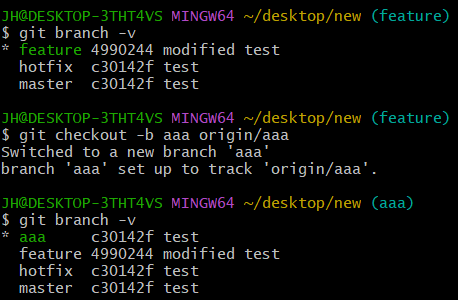 원격 브랜치 origin/aaa가 추가되었으니 로컬 저장소에 aaa 브랜치를 새롭게 생성하기로 한다.