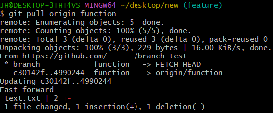 원본 저장소로 이동하여 function 브랜치를 로컬 저장소의 feature 브랜치로 내려받는다.