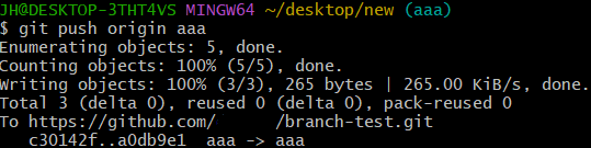push 명령어로 추가한 커밋을 원격 저장소 aaa 브랜치에 저장하였다.