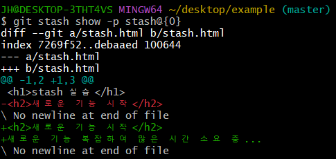 스태시를 실행한 후 전의 스태시와 현재 워킹 디렉토리 간 차이를 확인해보면