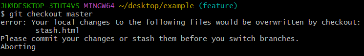 matser 브랜치에서 feature 브랜치를 만들고 feature 브랜치에서 작업 도중 커밋하지 않은 채로 master 브랜치로 체크아웃 시도했다.