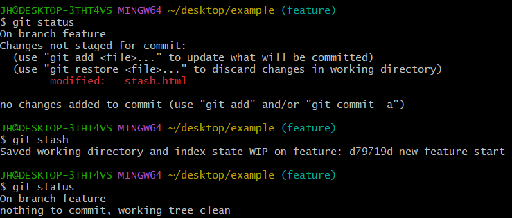스태시 명령을 실행하면 현재 작업 중인 내용은 임시 저장되고 수정 전 마지막 커밋 상태로 돌아간다.